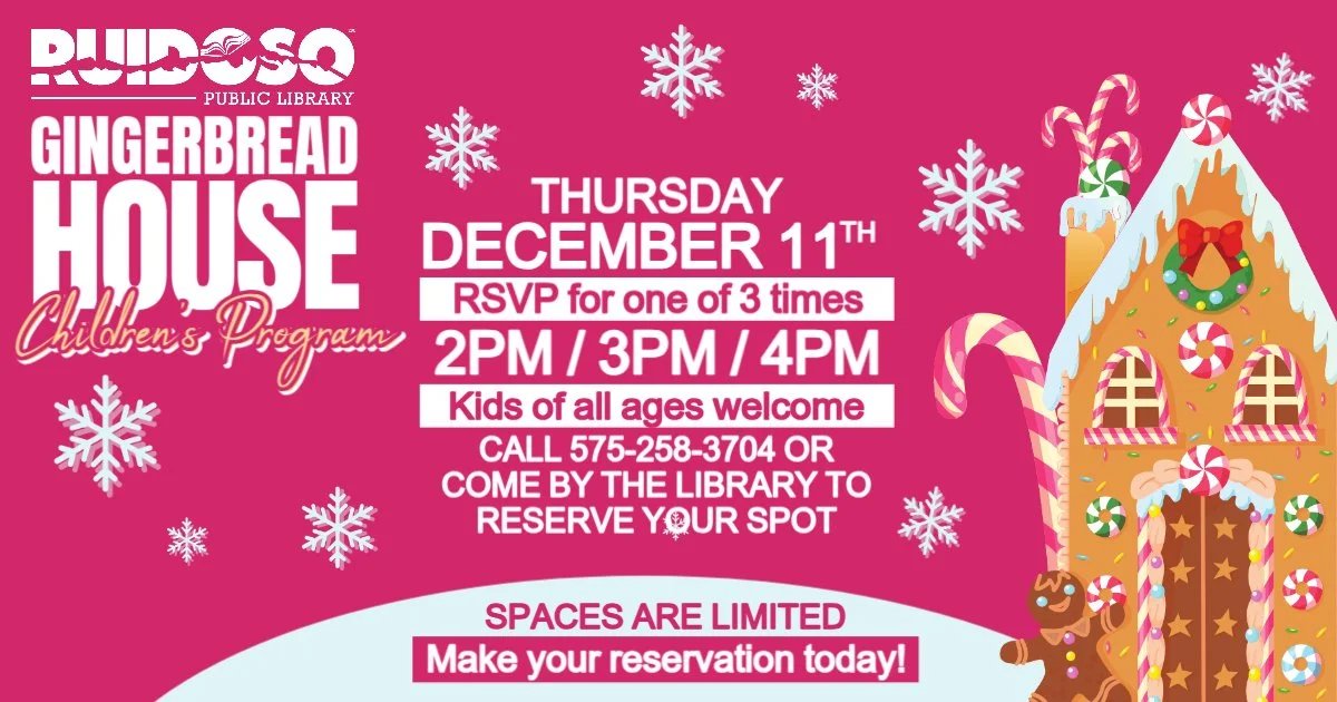 Celebrate the season with a sweet, hands-on holiday activity at the Ruidoso Public Library. Join us on Thursday, December 11th, and RSVP for one of three session times—2 PM, 3 PM, or 4 PM.